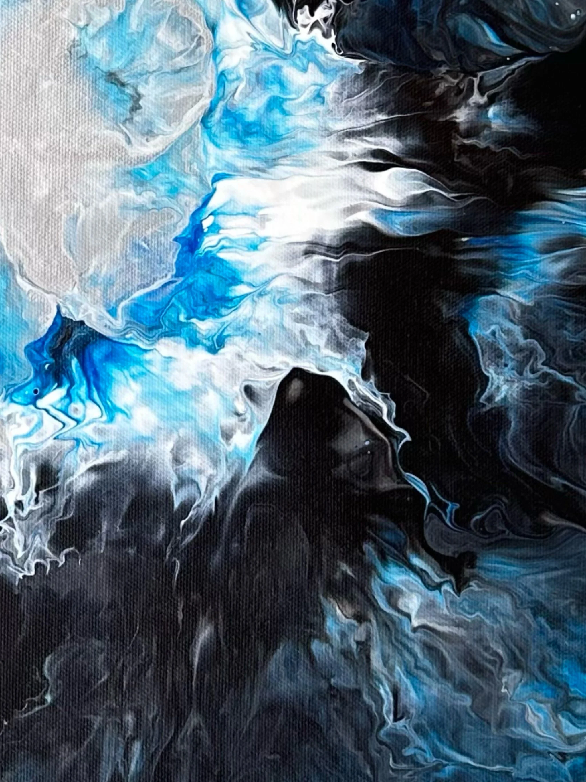 The collection "Creation of Galaxies" is a mesmerizing piece of art that immerses the viewer in the mysterious depths of the cosmos. Against a deep black background, a shimmering silver star shines at the center of the painting, from which vibrational waves of blue and turquoise hues emanate. These vibrations create an effect of dynamic movement, as if the star is radiating energy that envelops the surrounding space.