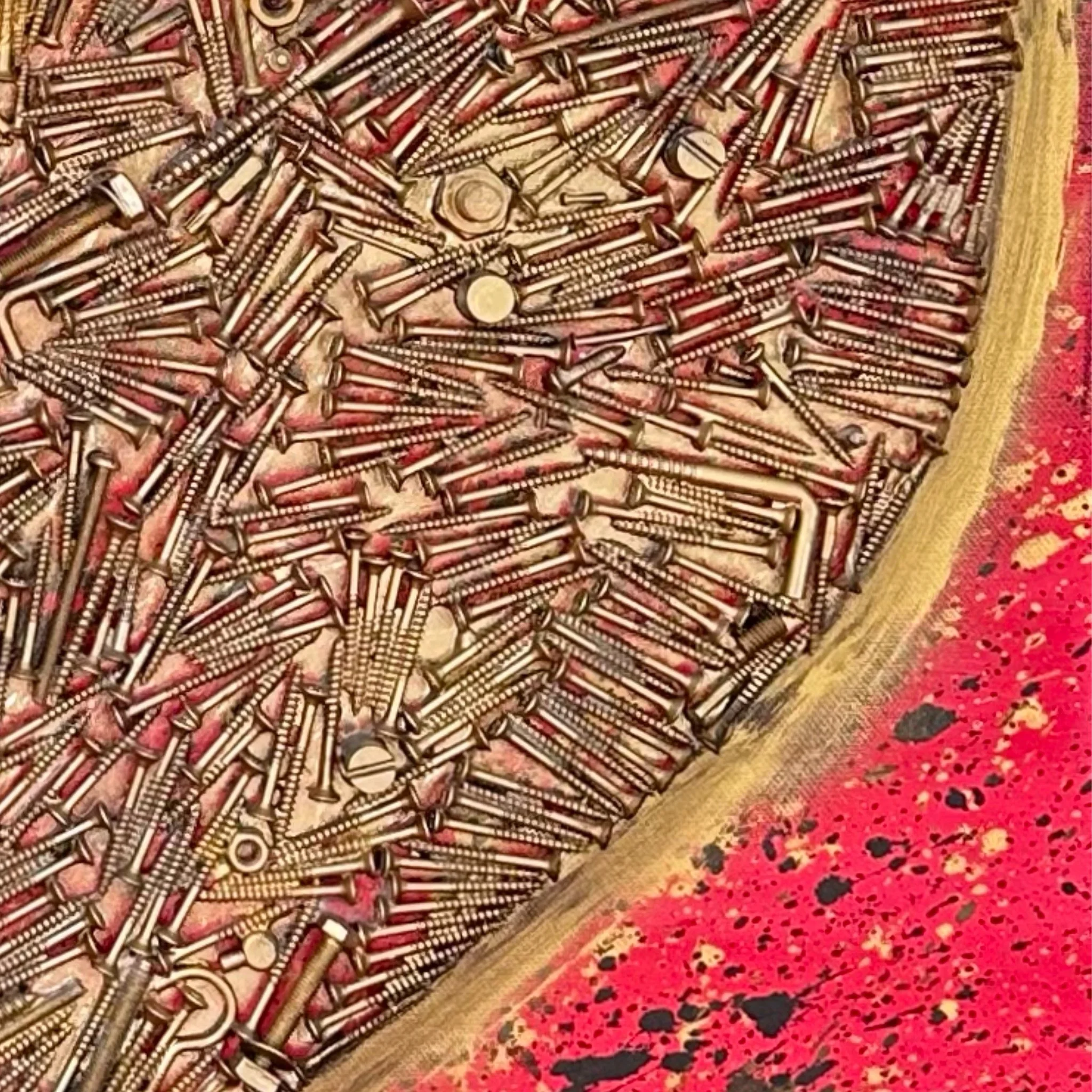 "Golden Heart" is a captivating metal relief painting featuring a striking red background adorned with dynamic gray splashes. At its center, a large golden heart crafted from metallic bolts symbolizes love and resilience. This engaging piece combines three-dimensional texture with bold colors, making it a perfect statement artwork that evokes passion and strength in any space.